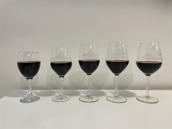 Til vinene fra Château de Haux, der typisk nydes af Bordeauxglas, fungerer 10–12 cl bedst.